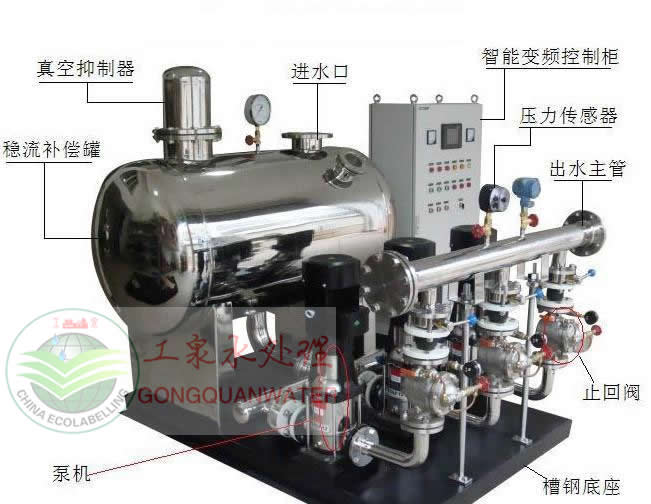 變頻恒壓供水設備由變頻控制柜、水泵機組、氣壓罐、引水罐、自動補水裝置、遠程信號傳感器及管路構件組成,用戶可依據需求自選組合。