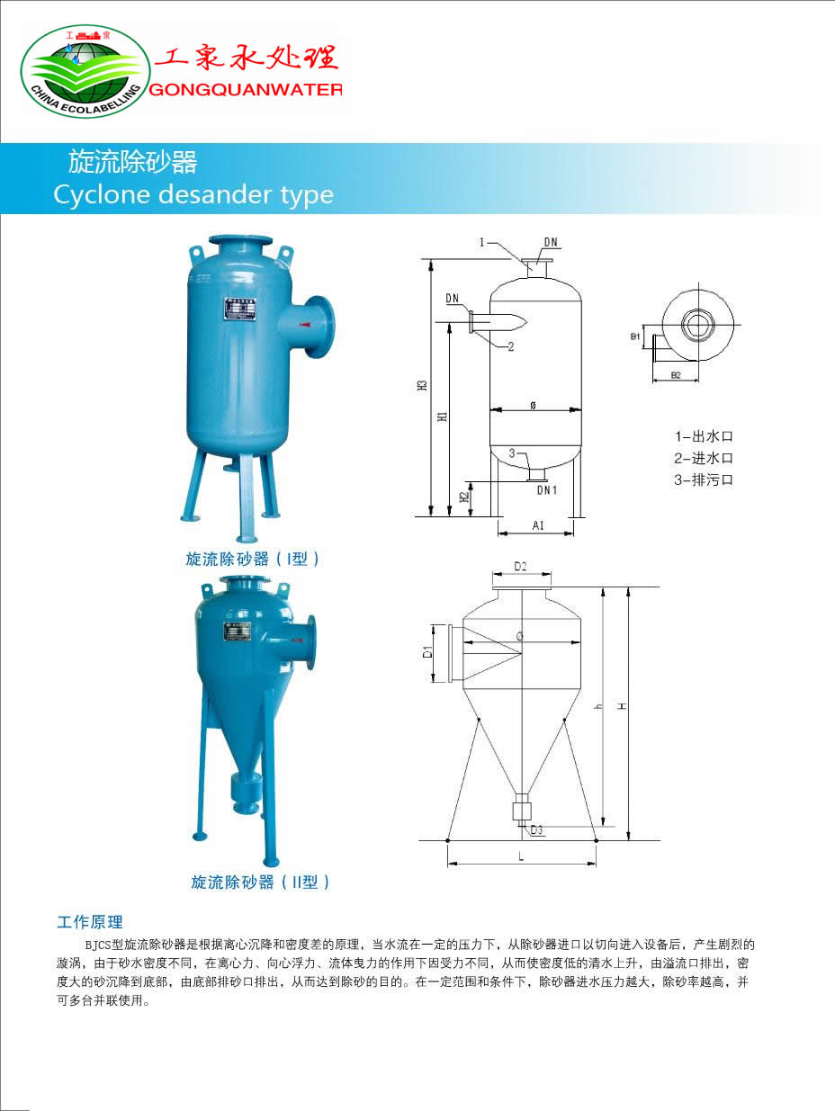 GQ系列旋流除砂器的特點: 1、結構簡單,操作簡便,使用安全可靠,幾乎不需維護。 2、與擴大管、緩沖箱等除砂設備相比,具有體積小,處理能力大,節(jié)省現(xiàn)場空間等優(yōu)點。 3、可在不間斷供水過程中清除水中的砂粒。 4、避免了其他除砂方式存在水質二次污染的現(xiàn)象,除砂效率高。